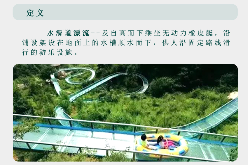 一是,依據(jù)大型生態(tài)漂流的體驗感,設(shè)計優(yōu)化升級而來。依地勢修建漂流槽,槽內(nèi)水深約20公分,水在漂流槽中托船順流而下,速度可控,刺激與安全兼得,確保百分之三百的安全。在設(shè)計上我們可以做到游客在漂流過程中基本不濕衣物。我們暫且稱這種形式的漂流為水滑道漂流。